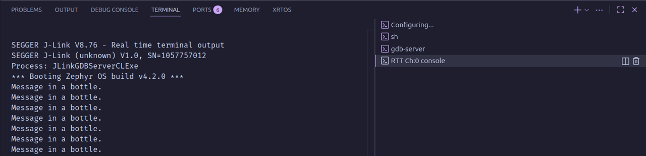 }Once your program is running in VSCode, open a new RTT Ch:0 terminal (if it's not already open) to view the messages being sent through printk. This time, you'll be using SEGGER RTT