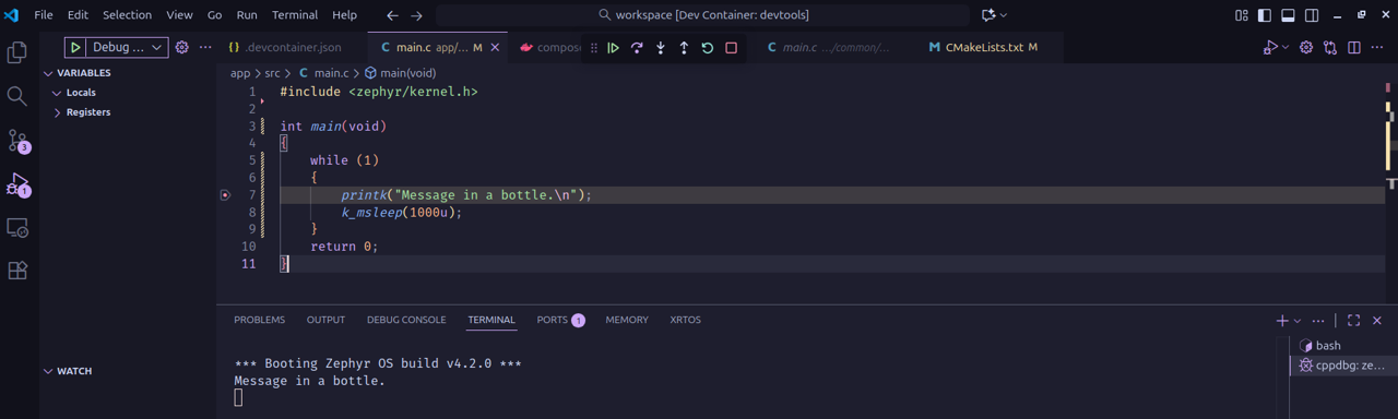 target_sources(app PRIVATE src/main.c)An executable is generated inside the build/zephyr directory. You can run it from the project’s root folder like this: (To stop the execution, just press Ctrl + C.)