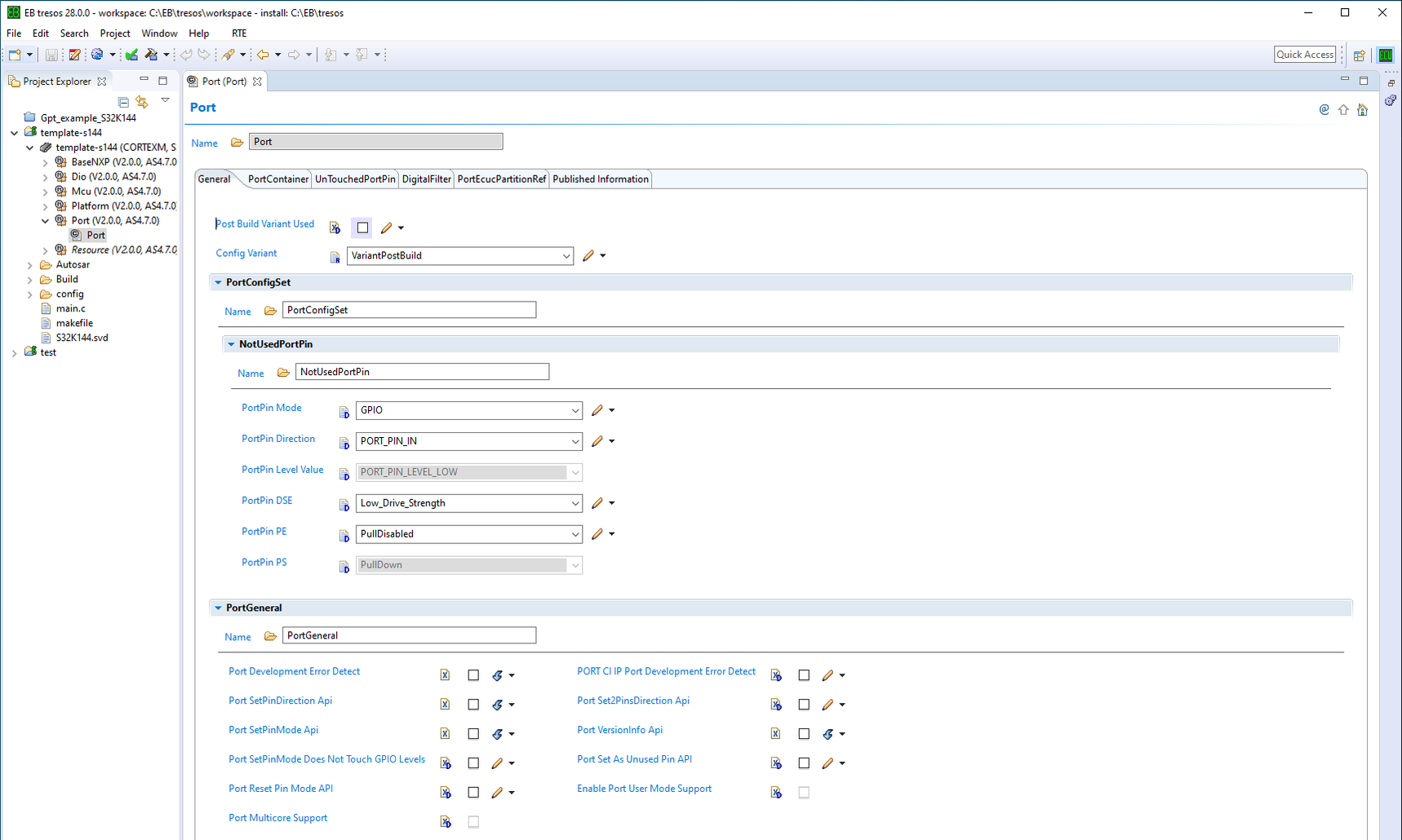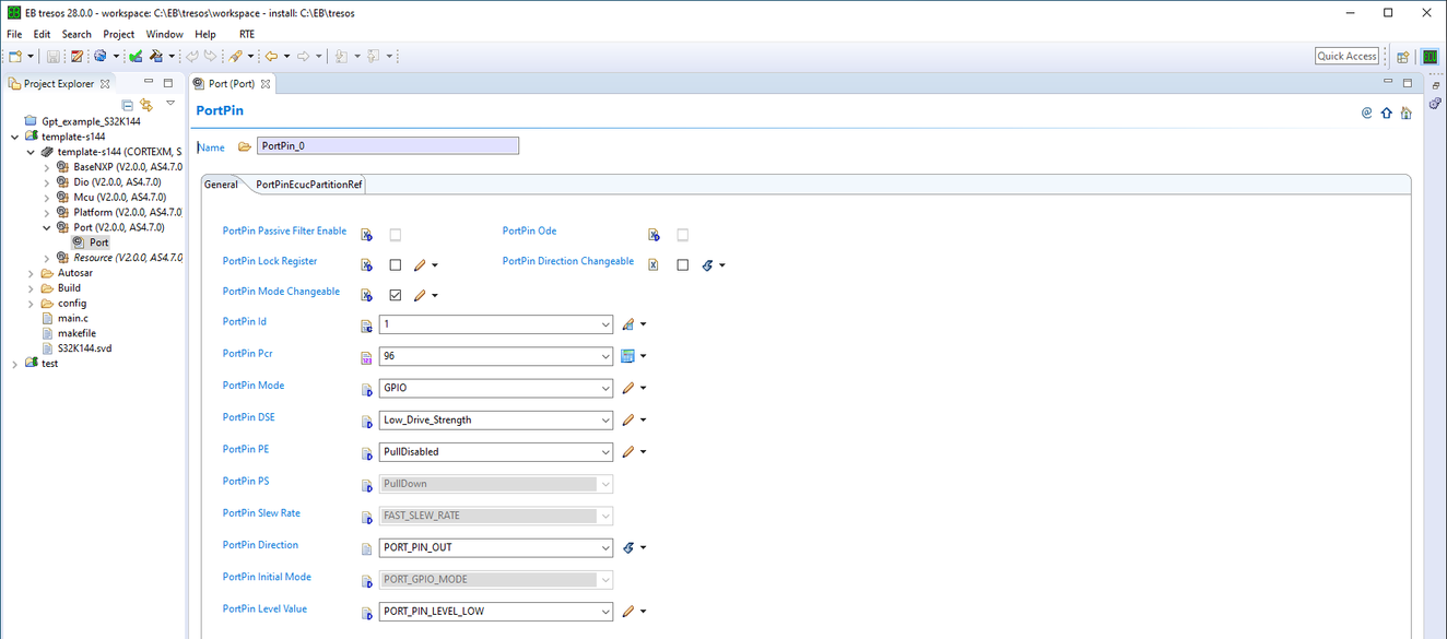 ... In the previous example, only port 96 (D0) is being configured as an output, leaving the remaining options with their default values. There are also no modifications made to the PortConfigset and PortGeneral containers. Finally, here's the configuration of the Dio Driver for the pin that we inverted in the template. Please review these options and identify them in Tresos.