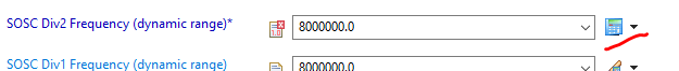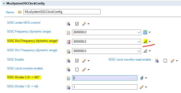 This really comes in handy when you are working with parameters that involve frequency values, for instance we are configuring the McuSystemOSCClockConfig and we decided to set SOSC Divider 2 by a value of 2, doing this we are force to write the resulting frequency in SOSC Div2 Frequency manually, ( the value is 4000000 ) or we can just click on the right icon “Set manually edited“