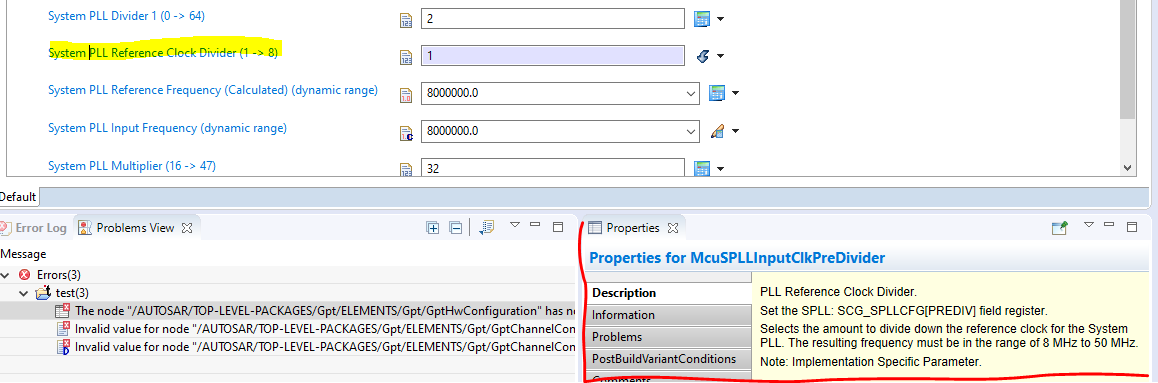 Sometime can be overwhelming to learn and/or remember the meaning of each parameter, and you gave to look again in the official documentation, AUTOSAR, drivers or the microcontroller manual. But Tresos can help you with that. Just click on the parameter name and you will see on the Properties window a nice an useful description. Even sometimes is not enough to understand 100% what the parameter does it gives an idea or it helps you to remember.