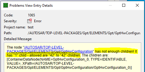 Some times AUTOSAR is going to ask you to set all the elements for a given container, otherwise it wont stop trowing you errors like this one ( says something about its missing children, 42 in total )