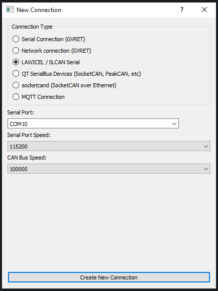 - Select LAWICEL / SLCAN Serial and the following settings