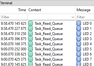Now on Terminal, we can observe that task WriteInQueue() now sent the complete array Led_Pin[NUMBER_OF_LEDS], even though the buffer size is 4 elements.