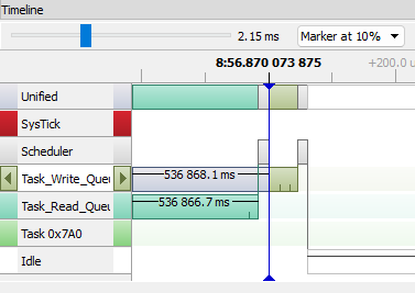 The timeline shows how the task WriteInQueue() sends data and after the task ReadInQueue() receives data and processes it. After finishing ReadInQueue() execution, WriteInQueue() sends the rest of the elements.