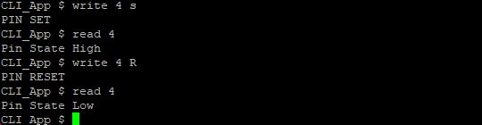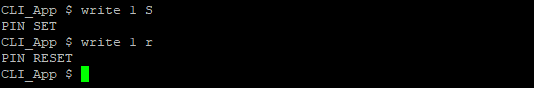 First, the write command is executed, observe that the parameters indicate that the user wants to set a high value on pin 1, when the command finishes, it prints a message indicating that the pin is in the Set state (high state).