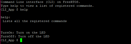 The application starts with the welcome message, to after writing in the terminal the "help" command to print the list of the commands registered. Observe that the command prints multiple lines including the string commands and a brief explanation of each one. Notice that is the data written in the "CLI_Command_Definition_t" structure. |