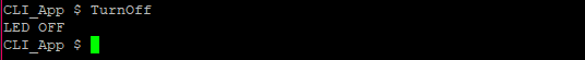 Next, the "TurnOff" command is typed and executed, printing the message indicating the LED state, and also turning off the LED. | ![]() |