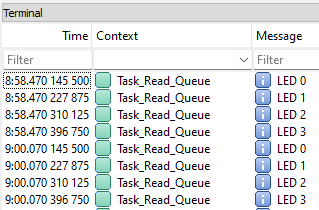 When the application is executed we can observe that Task ReadInQueue() only receives from the Queue buffer 4 elements from the array Led_Pin[NUMBER_OF_LEDS] in task WriteInQueue(). The rest of the data is lost, this can happen if the Queue buffer fills.