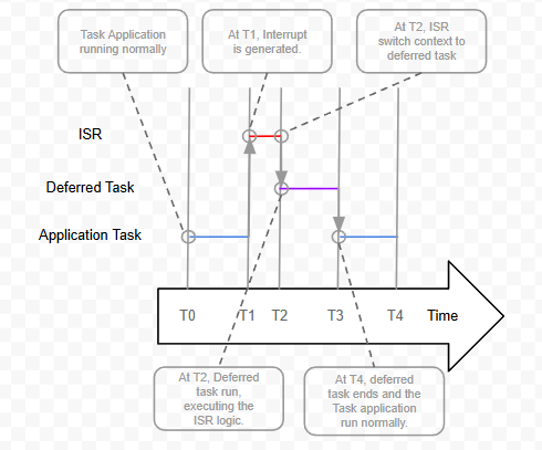 To execute the deferred task after the ISR, the interrupt function needs to be configured to change the context to the deferred task when the interrupt ends. This ensures that the logic of the interrupt is executed immediately after the ISR execution by the task unblocked.