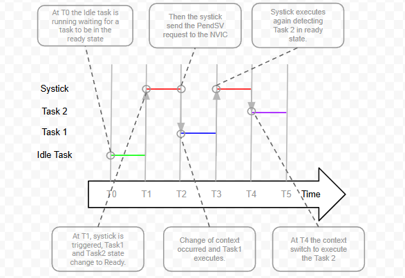 Observe the image, suppose that 2 tasks are created with the same priority. At T0 the Idle task is running waiting for a task to be in the ready state. At T1 When the systick interrupt is triggered, both tasks are now in a ready state, and the systick calls the function xPortSysTickHandler which is in charge of decide if the scheduler needs to switch the context, in this case, it is needed and the function sets the PendSV register to indicate to the NVIC to change the context. At T2 observe that Task1 is executed, At T3 when the systick executes again, will notice that there are other task ready to execute with the same priority, and then the function calls to the NVIC to switch the context again. At T4 Task 2 starts running to finish at T5.