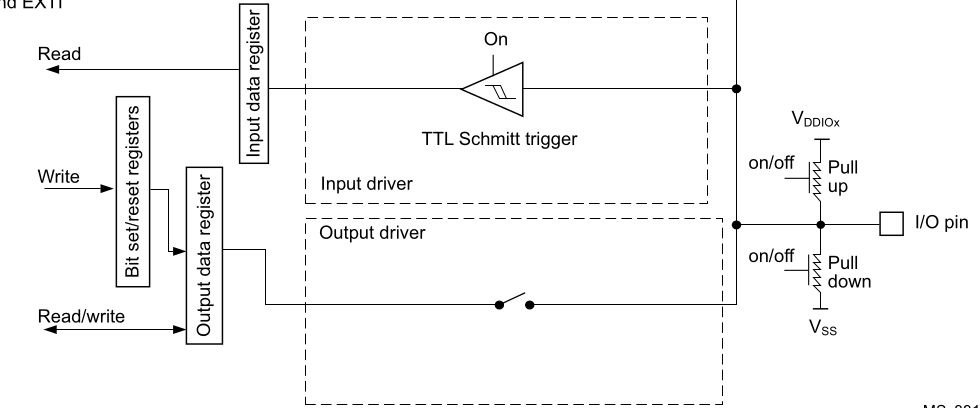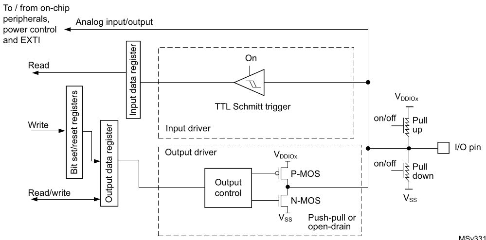 - Open drain mode: A “0” in the Output register activates the N-MOS whereas a “1” in the Output register leaves the port in Hi-Z (the P-MOS is never activated)