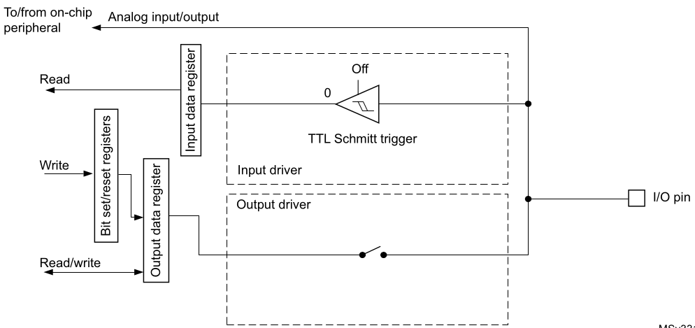 - The Schmitt trigger input is deactivated, providing zero consumption for every analog value of the I/O pin. The output of the Schmitt trigger is forced to a constant value (0).