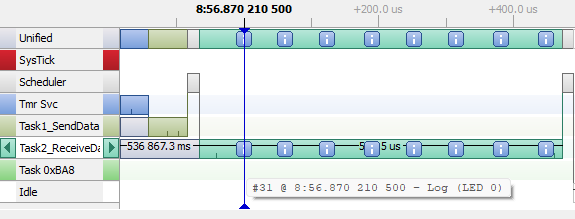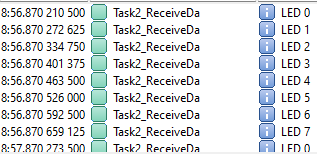 Now observe the timeline, “Task1_SendData“ is the task that sends the array to the message buffer, starts first, and sends the data to the buffer, after “Task2_ReceiveDa“receives the message from the buffer, observe that after the task unpacks each element from the array and prints on the terminal.