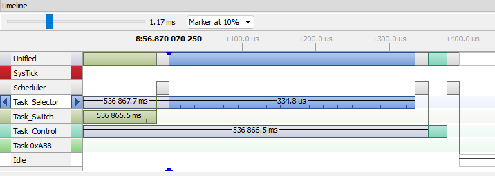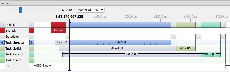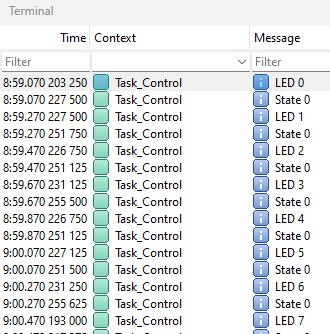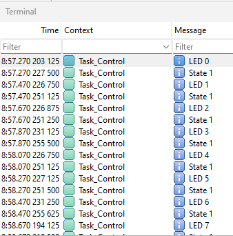 We can observe task behavior. After initialization, the first task Task_LED_Selector starts to work, sending the data of pins to the Queue buffer to be received by the other 2 tasks. |