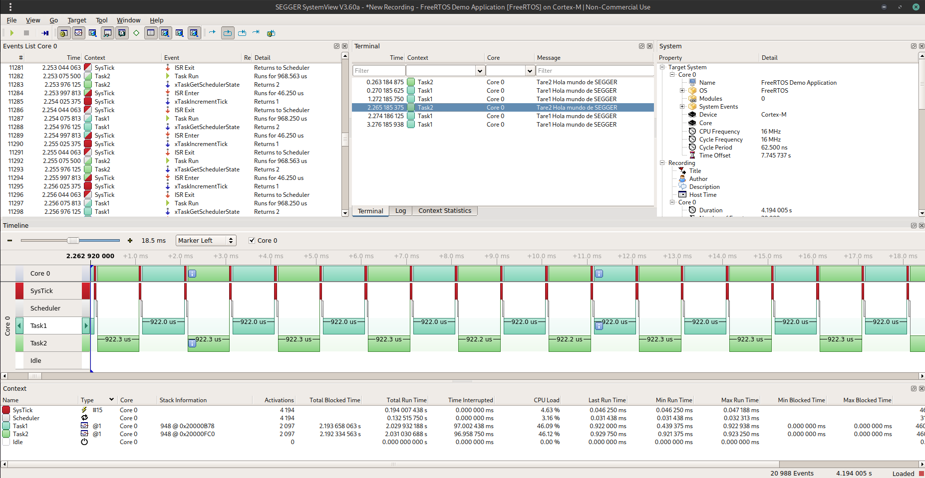 }Once your program is running with using the CLI or the VSCode cortex-debug (or any other debugger), open systemview and click on the play icon (green triangle), then you can stop anytime since your program repeats always the same routines. You’ll see the task running and been switching in and out, the scheduler running, log events and messages printed, besides the CPU usage of each task.