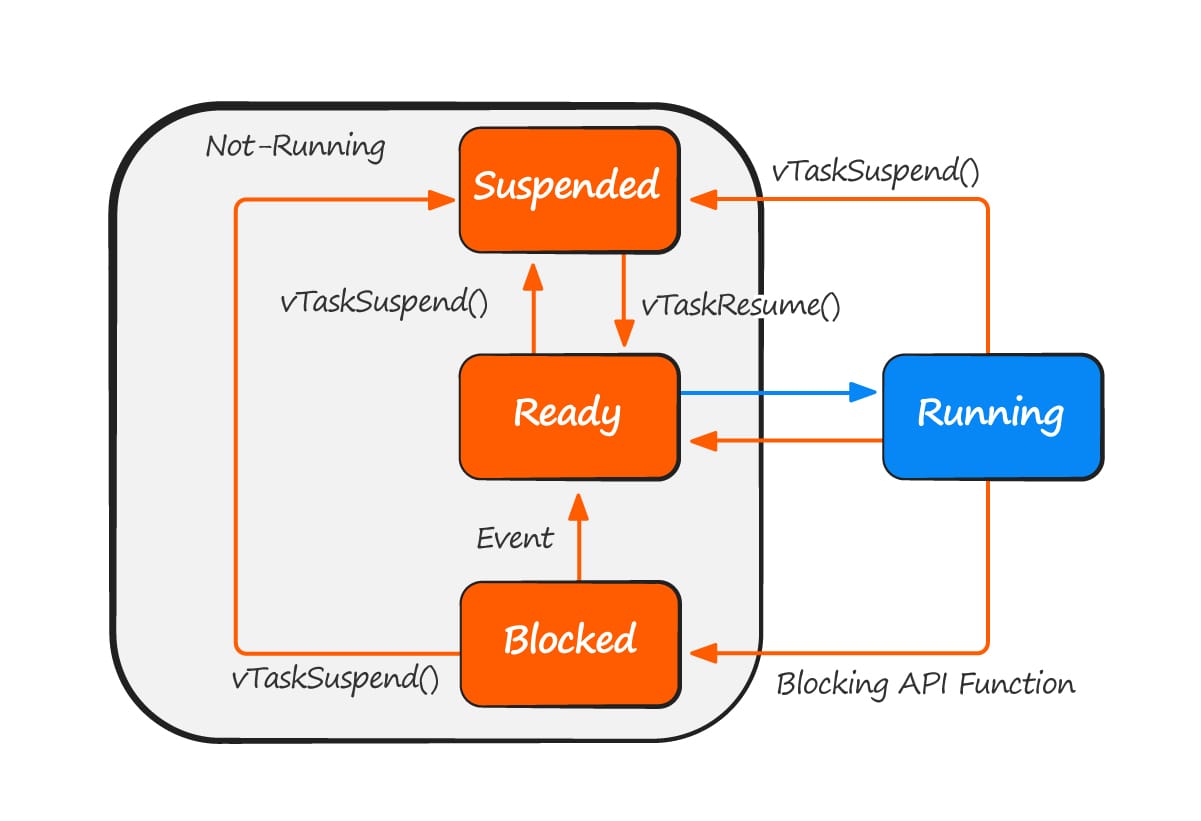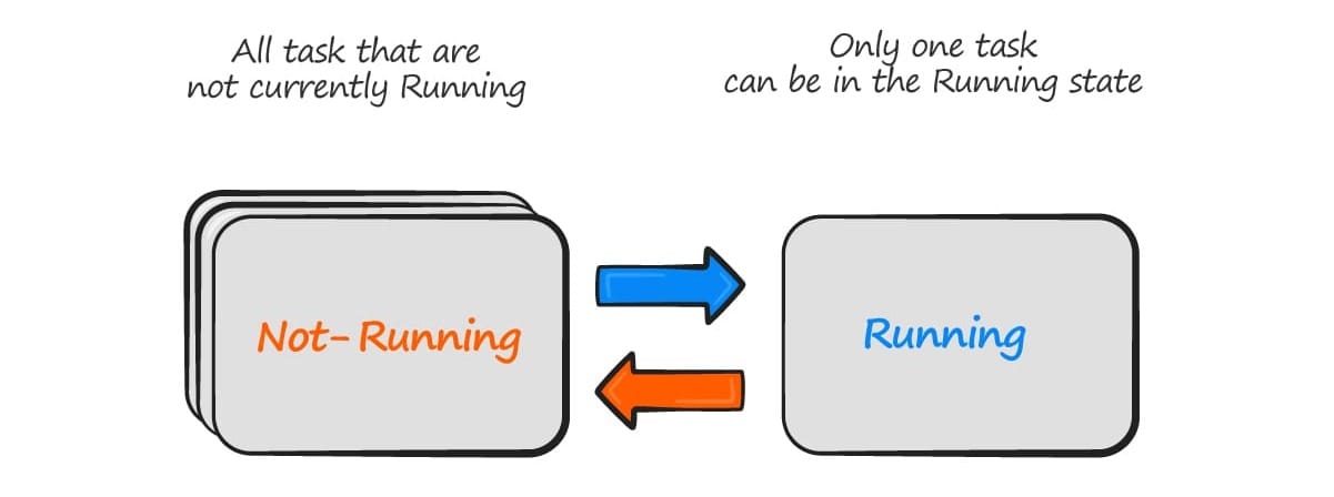 }An application can consist of many tasks. If the microcontroller running the application only contains a single core, then only one task can actually be executing at any given time. This implies that a task can exist in of two states, "Running and Not-running"