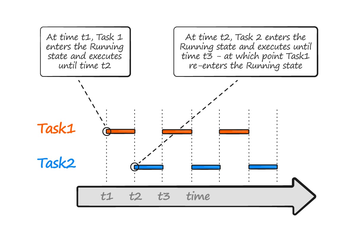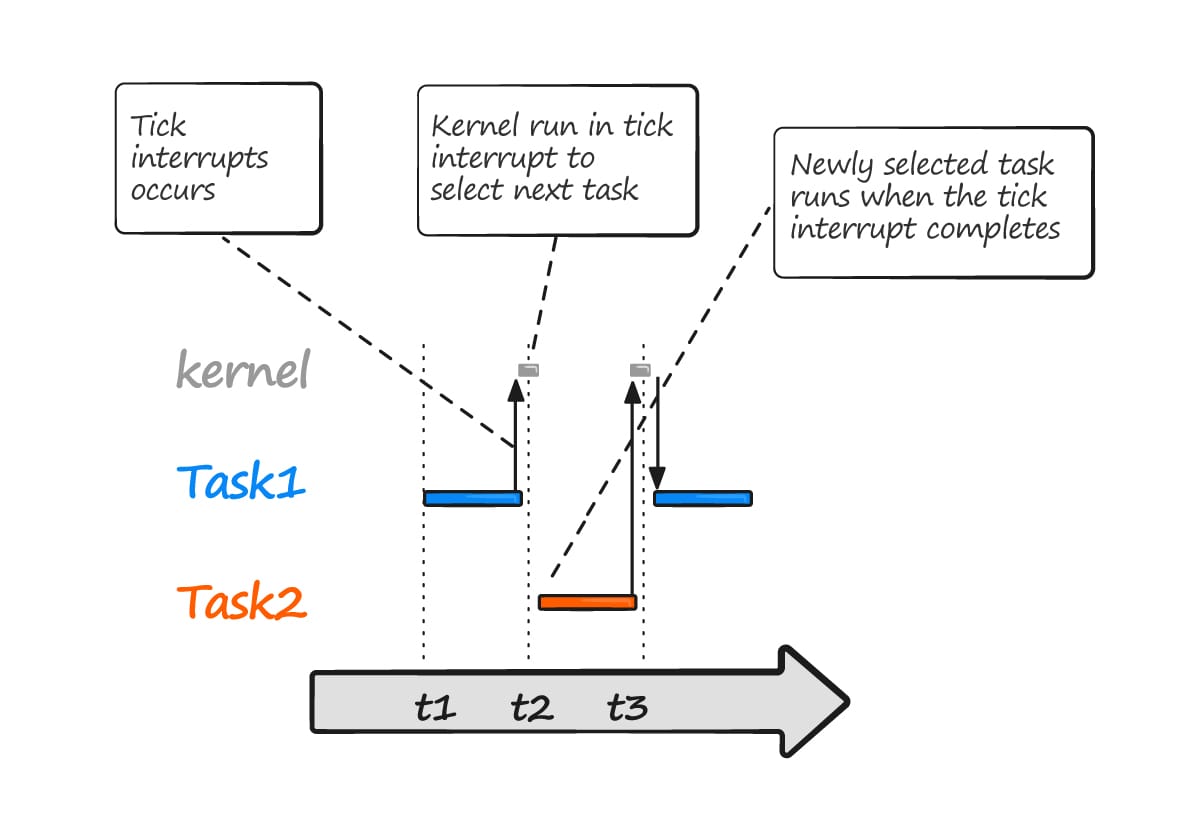 Each task executes for a “time slice”; it enters the running state at the start of the time slice and exits the running state at the end of the time slice.To be able to select the next task to run, the scheduler itself must execute at the end of each time slice. The “tick interrupt”, is used for this purpose.