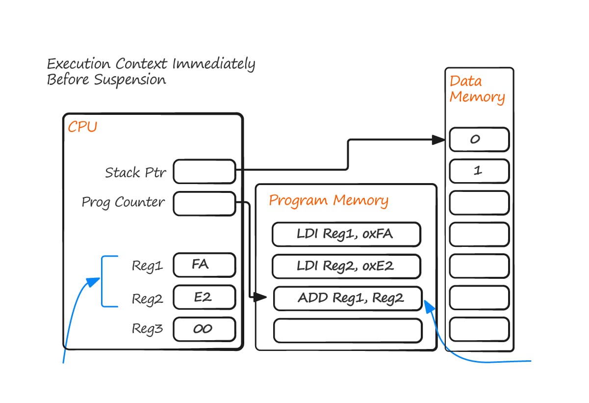 The operating system kernel is responsible for ensuring that upon resumption a task has a context identical to that immediately prior to its suspension and does so by saving the context of a task as it is suspended. When the task is resumed its saved context is restored by the operating system kernel prior to its execution.