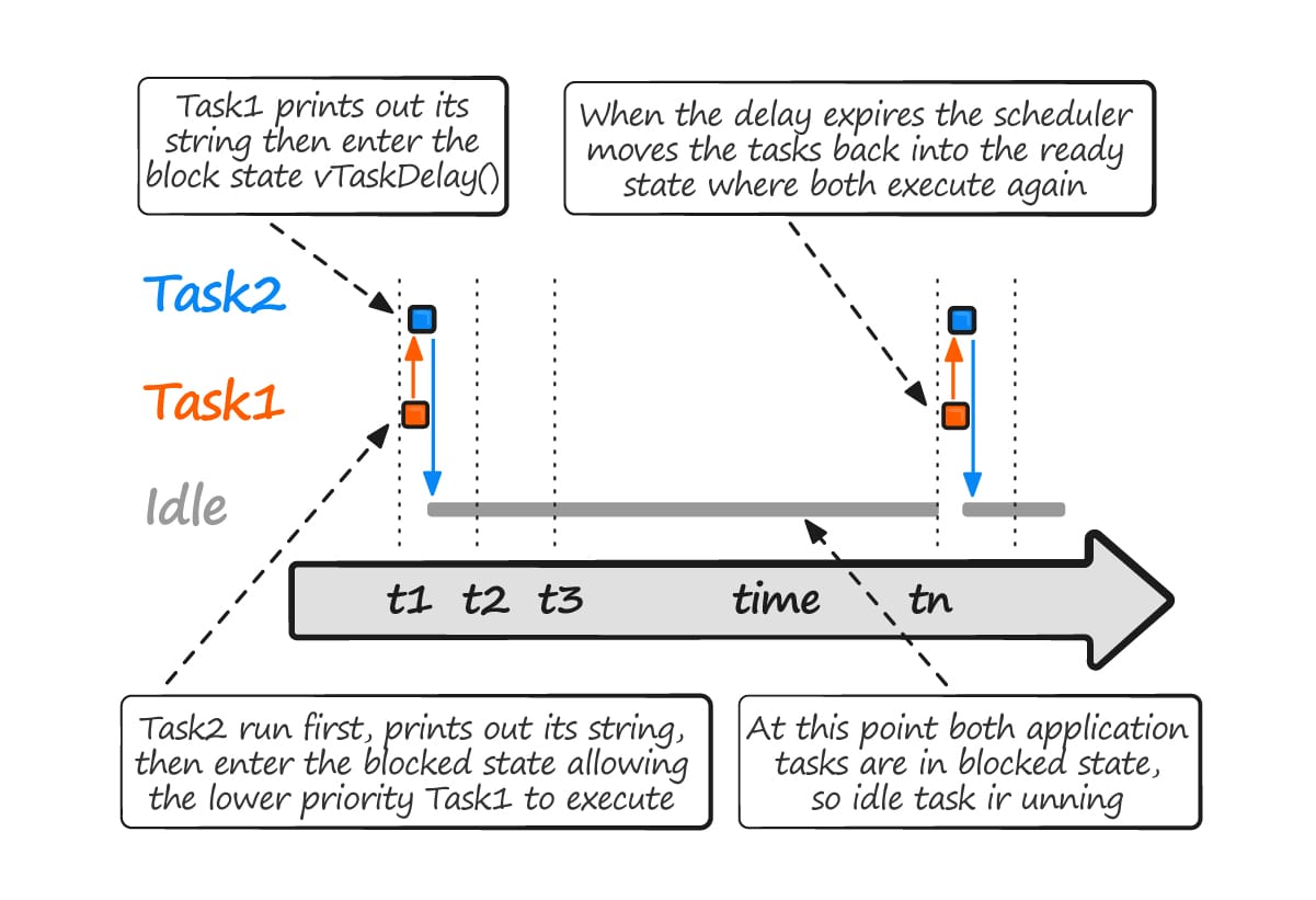 The task created in example #1 spend most of their time in the blocked state. In this state, they are not able to run and can not be selected by the scheduler. The processor always need something to execute, so there must be at least one task that can enter the Running state. to ensure this is the case, an idle task is automatically created by the scheduler when vTaskStartScheduler() is called.