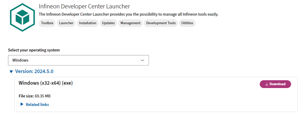 Got to Infineon web page and download the Infineon™ Development Center using the following link Infineon Developer Center Launcher - Infineon Technologies It is necessary to register using your company email. Install the software with Quick Installation option