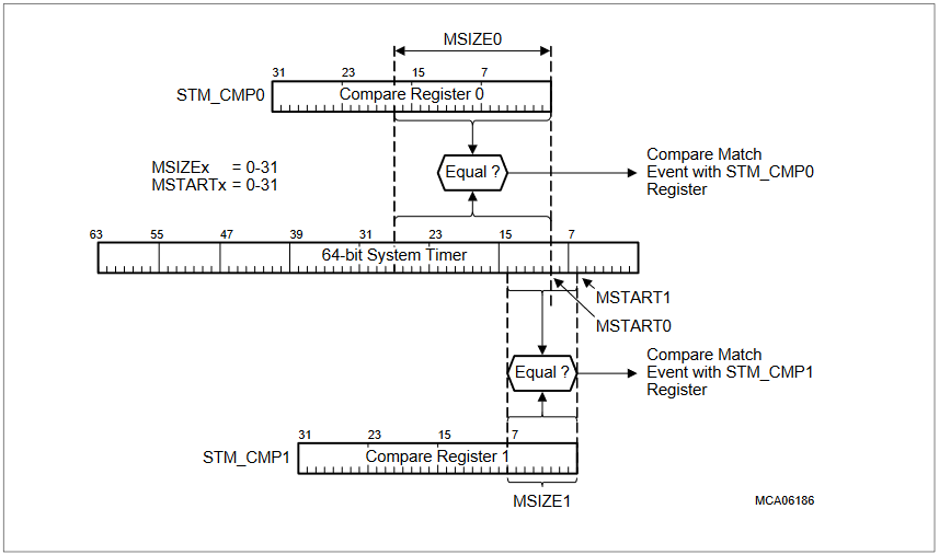These programming capabilities make compare functionality very flexible. It even makes it possible to detect bit transitions of a single bit n (n = 0 to 31) within the 64-bit STM by setting MSIZE = 0 and MSTART = n