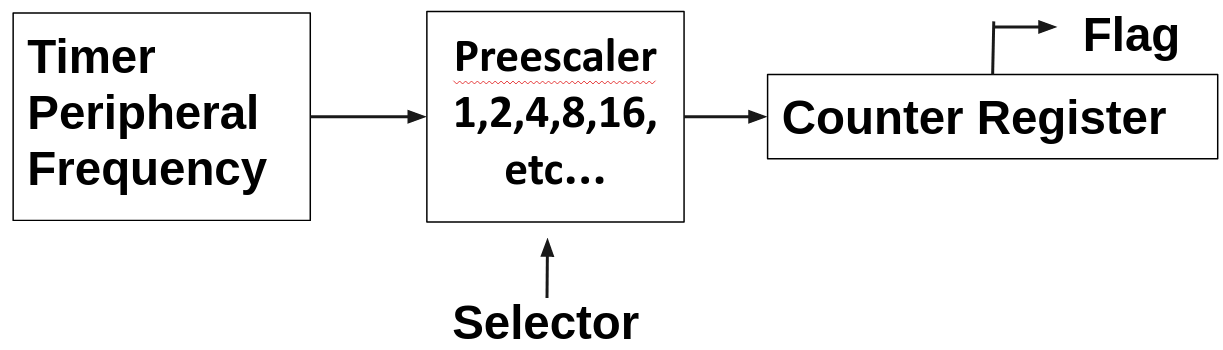 The following diagram is a very basic representation of a typical Timer within a microcontroller, consisting of a counter register, prescaler, and clock source. The clock source provides the input pulses to the Timer, which are then divided or pre-scaled by the prescaler. The resulting pulses are used to increment the value in the counter register. As the counter value increases, it represents the elapsed time. When the counter reaches its maximum value, an overflow event may occur, triggering a flag or interrupt. This basic structure allows the Timer to measure time intervals by counting pulses and provide various timing functionalities in microcontroller applications.