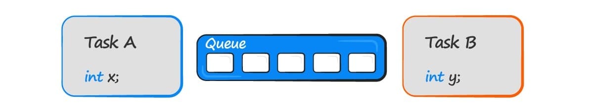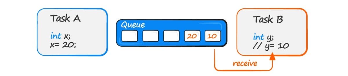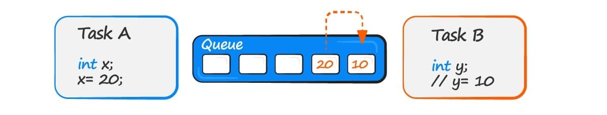 - Task B reads (receives) from the queue into a different variable. The value received by task B is the value from the head of the queue.