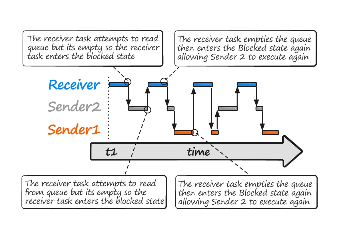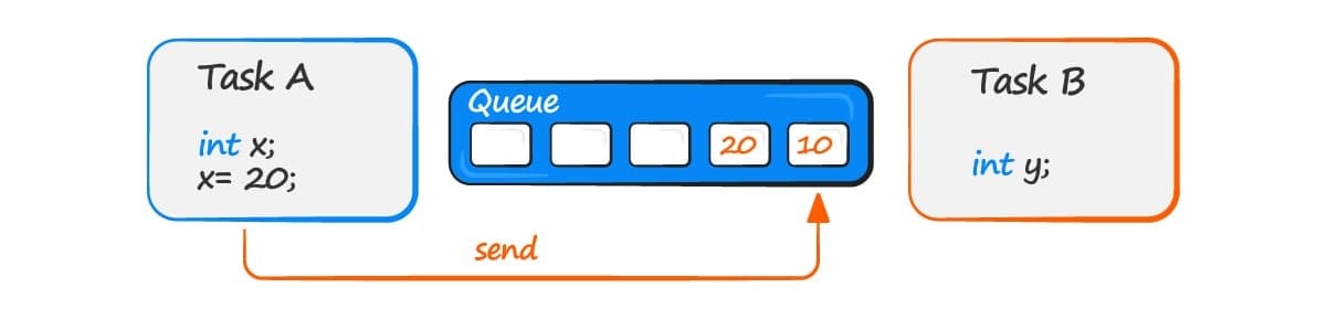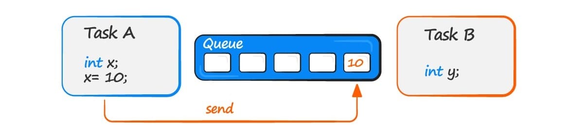 - Task A writes (sends) the value of a local variable to the back of the queue. as the queue was previously empty, the value is now the only item in the queue.