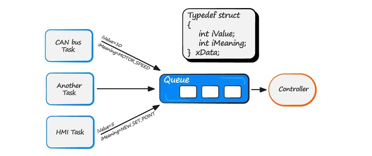 It is common for a task to receive data from multiple sources on a single queue. Often, the receiver of the data needs to know where the data came from. A simple way to achieve this is to use the queue to transfer structures with the source and the value.