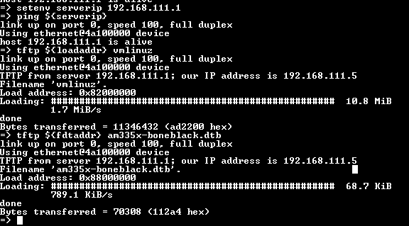 $ sudo cp /path/to/linux-source/arch/arm/boot/dts/ti/omap/am335x-boneblack.dtb /srv/beagle/tftp- Check that the TFTP server is working by making U-Boot load the kernel and device tree from the host platform.