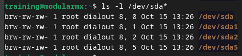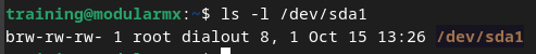 The first thing to notice is the b character before the permission bits. This indicates that the file is a block device.