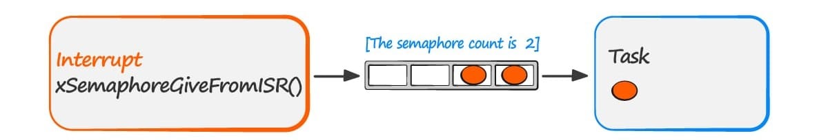 The binary semaphore can latch almost one interrupt event. Any subsequent events occurring before the latched event has been processed will be lost. In order to avoid the last scenario counting semaphores should be used. Counting semaphores are like queues, but in this case data is not important just the number of the events.