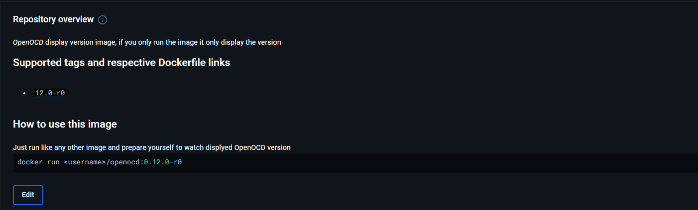 - IP_ADDR=172.17.0.3Getting back to our image we can push the new version of our image as a minor version like openocd:12.0.r1, because why not, after pushing the new version take a look at your docker hub repo and of course update the overview properly