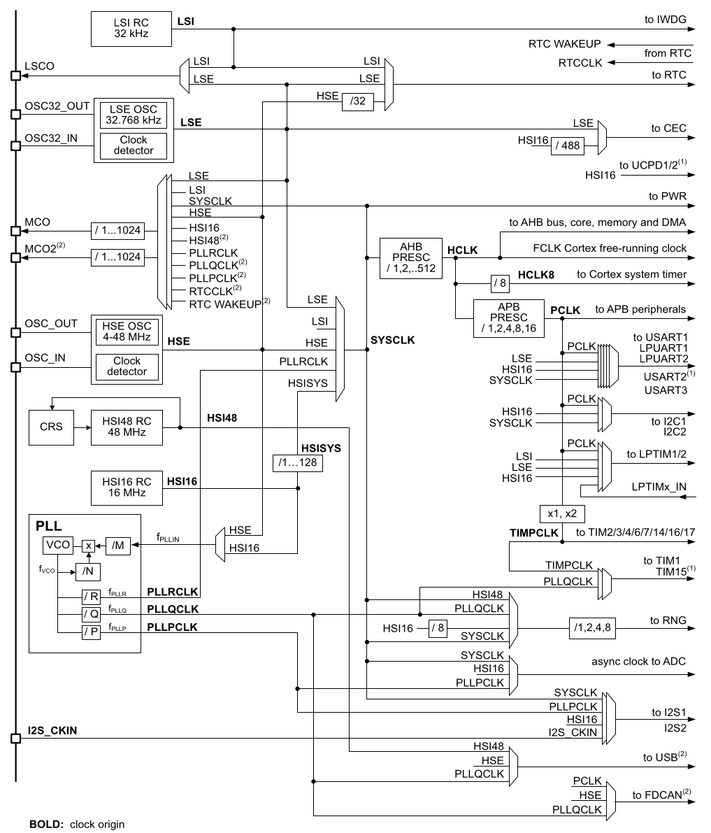 The external oscillator (HSE) can generate its frequency from a crystal or an oscillator, while the internal oscillator (HSI16) takes the frequency from a 16MHz internal RC oscillator. Both clock sources can feed into the frequency multiplier (PLL) to provide the necessary frequency to the main oscillator. On the other hand, the other internal oscillator (HSI48) is only used to feed the USB and RNG. The frequency multiplier (PLL) has two clock inputs (HSE and HSI) and three outputs. The primary output is PLLRCLK, which becomes SYSCLK and feeds the CPU and AHB and APB buses.