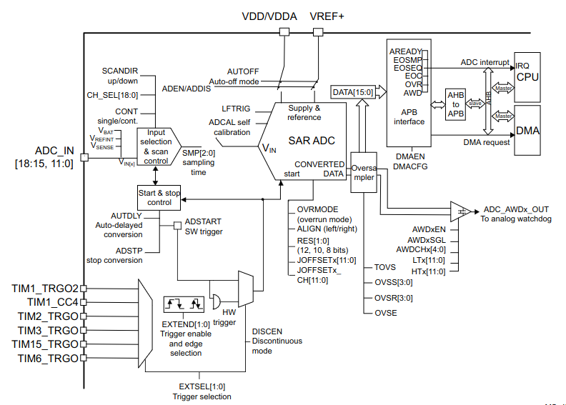 - Interrupt generation at the end of sampling, end of conversion, end of sequence conversion, and in case of analog watchdog or overrun events