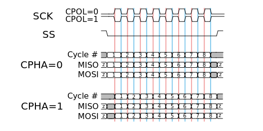 In addition to configuring the transmission frequency in the SPI protocol, the clock polarity and phase with respect to the data signals must also be set. These two options are commonly referred to as CPOL (Clock Polarity) and CPHA (Clock Phase).