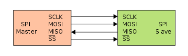 The connection between two SPI devices is typically done using 4 wires: Clock signal (SCLK), Master Out Slave In (MOSI) data line, Master In Slave Out (MISO) data line, and a chip select (SS) line activated low.