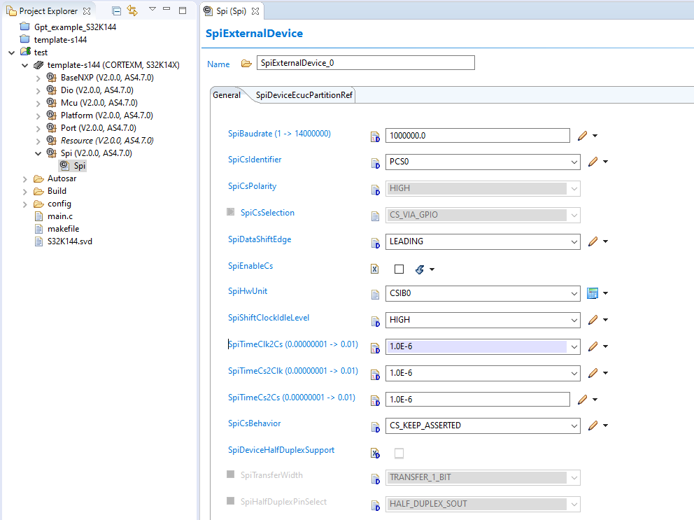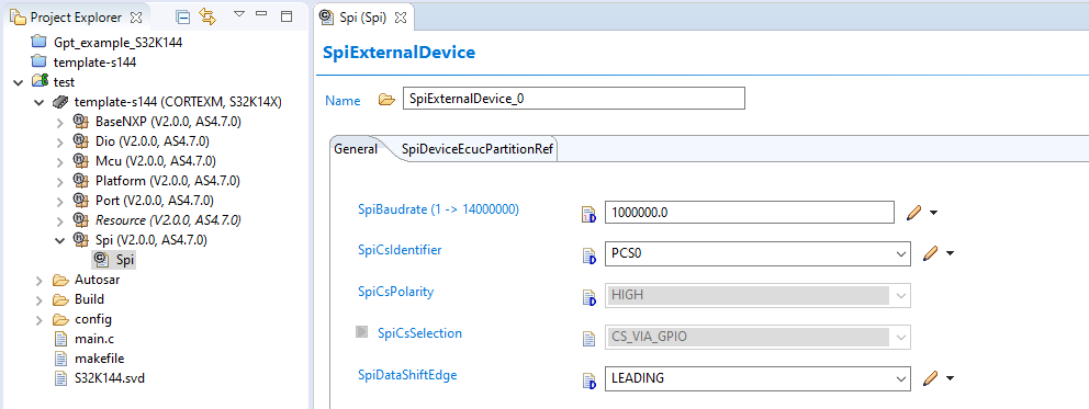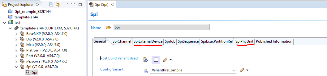 To start configuring the the Spi module we need to locate the SpiExternalDevice and the SpiPhyUnit containers where we can found the typical parameter to configure our spi peripheral like the actual LPSPI to use, master or slave mode and the clock source, baud-rate, clock polarity and phase amount others. The contents of these container are really attached to the hardware characteristics of our peripheral, so it is important to read the micro reference manual to set the correct parameters.