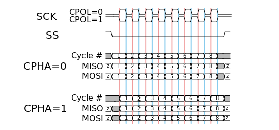 In addition to configuring the transmission frequency in the SPI protocol, the clock polarity and phase with respect to the data signals must also be set. These two options are commonly referred to as CPOL (Clock Polarity) and CPHA (Clock Phase).