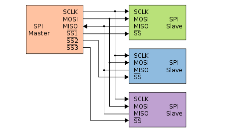 The SPI communication protocol is a bus, which means that multiple devices can be connected to it. In such cases, only one device should act as the master, and the remaining devices must be set as slaves. Each slave device should have its own Slave Select (SS) line, while the Clock (SCLK), Master Output Slave Input (MOSI), and Master Input Slave Output (MISO) lines can be shared among all devices..