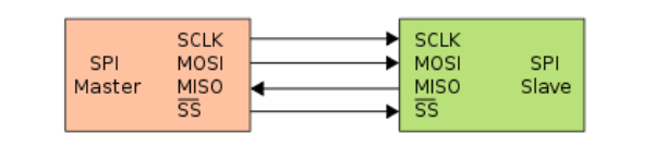 The connection between two SPI devices is typically done using 4 wires: Clock signal (SCLK), Master Out Slave In (MOSI) data line, Master In Slave Out (MISO) data line, and a chip select (SS) line activated low.