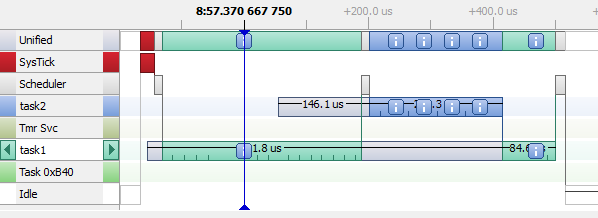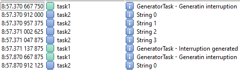 Notice that task1 is a little longer compared with the last 2 examples, this is caused by the for loop sending a message to a queue, when the loop finishes task1 executes the interruption, which will read all the messages on the Queue to send another Queue now with strings data, after, the task2 is executed to read the strings message on Queue and print on the terminal the data. Finally, the task resumes to print that interruption was generated.