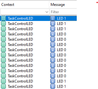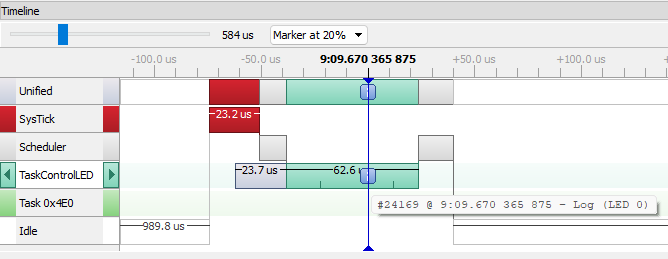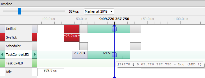 Now in timeline, we can observe that only one task is executing, which is in charge of updating the pin state according the Queue message received. |