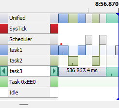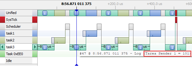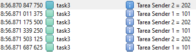 The system View output is equal to the previous program. The Receiver task processes the messages and identifies which sender task sent the message.