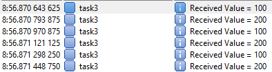 Modify the previous program so that the tasks sending data do so every 300ms, and determine in the receiving task when a timeout occurs and when data arrives.