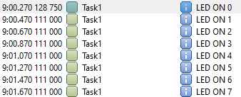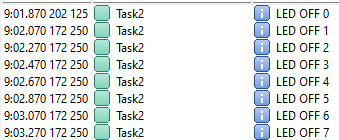 Task1 is running taking the mutex each execution, the first image shows the Task1 execution when an LED is turned on.
