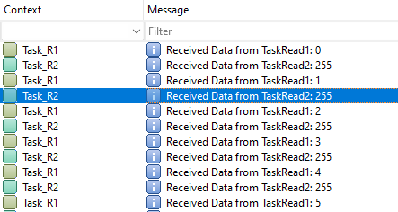 Terminal shows how the task receives synchronously the correct message, Task_R1 always receives the counter and Task_R2 receives a static value.