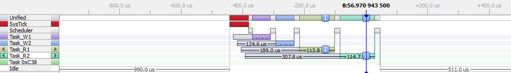 Observe the execution of the task, task_w1 executes first sending the static message, and task_w2 sends the increment number. Tasks are using a semaphore to synchronize the execution of the reader task, each reader task will receive the appropriate task to be printed on the terminal.