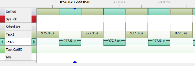 Notice that this timeline is similar to the last example, this time 2 tasks are running and the change of context made for the systick of the scheduler is more evident.